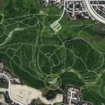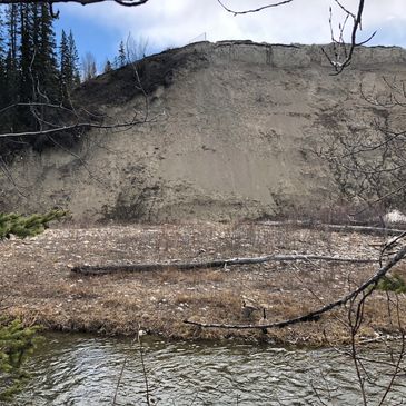 From the north side of Fish Creek, you can see the Lochend Formation Till capped by glacial lake sediments. The gravels below are modern-age fluvial deposits. Don't cross the creek and please obey the signs and fences that are up for riparian ecosystem restoration.